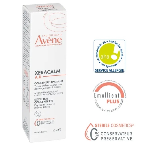 Концентрат проти свербіння XeraCalm AD миттєво полегшує сухі ділянки, схильні до сильного свербіння та атопічного дерматиту. Це SOS-допомога для негайної дії проти свербіння завдяки I-modulia, першому постбіотичному активному інгредієнту, отриманому з термальної води Avène. I-modulia® зменшує свербіж*, стимулює захисні механізми шкіри та бореться з подразненням. У поєднанні з висококонцентрованим захисним та відновлювальним комплексом, який зменшує сильну сухість, відновлюючи комфорт шкіри, та термальною водою Avène, яка природним чином заспокоює, знімає подразнення та зменшує запалення, він ідеально підходить для ділянок шкіри, що постійно свербіть, таких як обличчя, тіло та повіки. Завдяки Sterile Cosmetics, унікальній технології, яка зберігає продукт стерильним протягом усього використання, та ексклюзивній, ідеально герметичній захисній упаковці, цей SOS-допомога гарантує оптимальну переносимість для шкіри та її мікробіому. Без консервантів, без ароматизаторів, некомедогенний, розроблений з мінімальною кількістю інгредієнтів та мінімізуючи ризик алергічних реакцій, концентрат проти свербіння XeraCalm AD ідеально підходить для шкіри немовлят (від народження), дітей та дорослих.