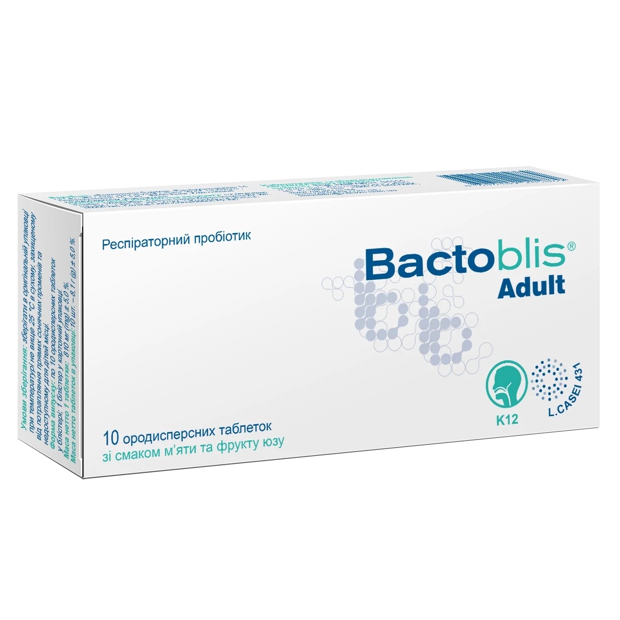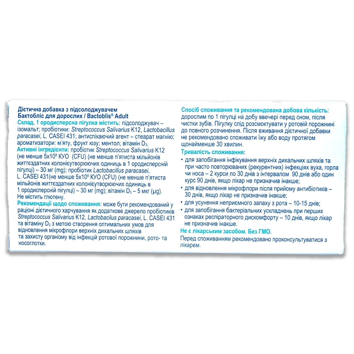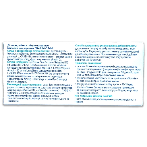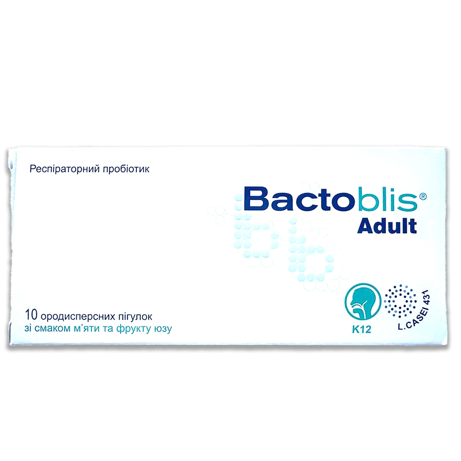 Бактобліс для дорослих – ексклюзивна формула, що поєднує Streptococcus salivarius K12 (для покращення місцевого захисту верхніх дихальних шляхів) та Lactobacillus paracasei, L. CASEI 431 (покращує системну відповідь організму у боротьбі зі збудниками інфекцій).