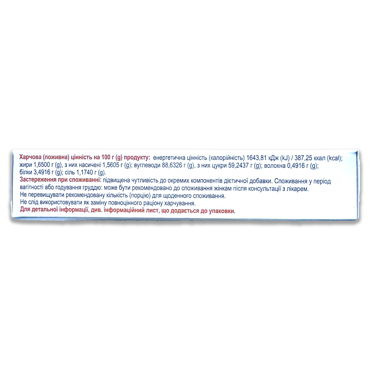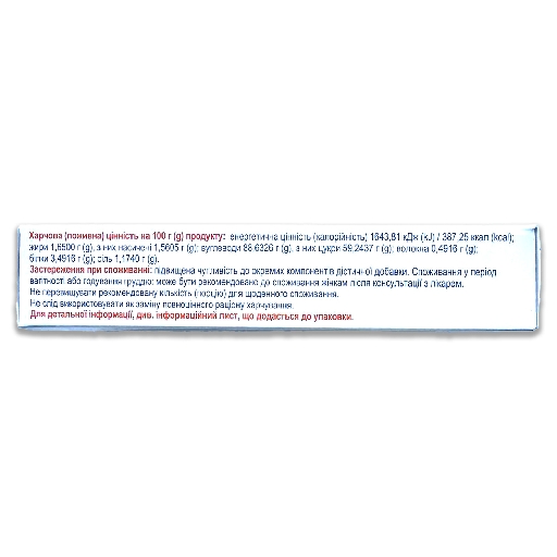 Харчова (поживна) цінність на 100 г (g) продукту: енергетична цінність (калорійність) 1643,81 кДж (kJ) / 387,25 ккал (kcal); жири 1,6500 г (g), з них насичені 1,5605 г (g); вуглеводи 88,6326 г (g), з них цукри 59,2437 г (g); волокна 0,4916 г (g); білки 3,4916 г (g); сіль 1,1740 г (g).