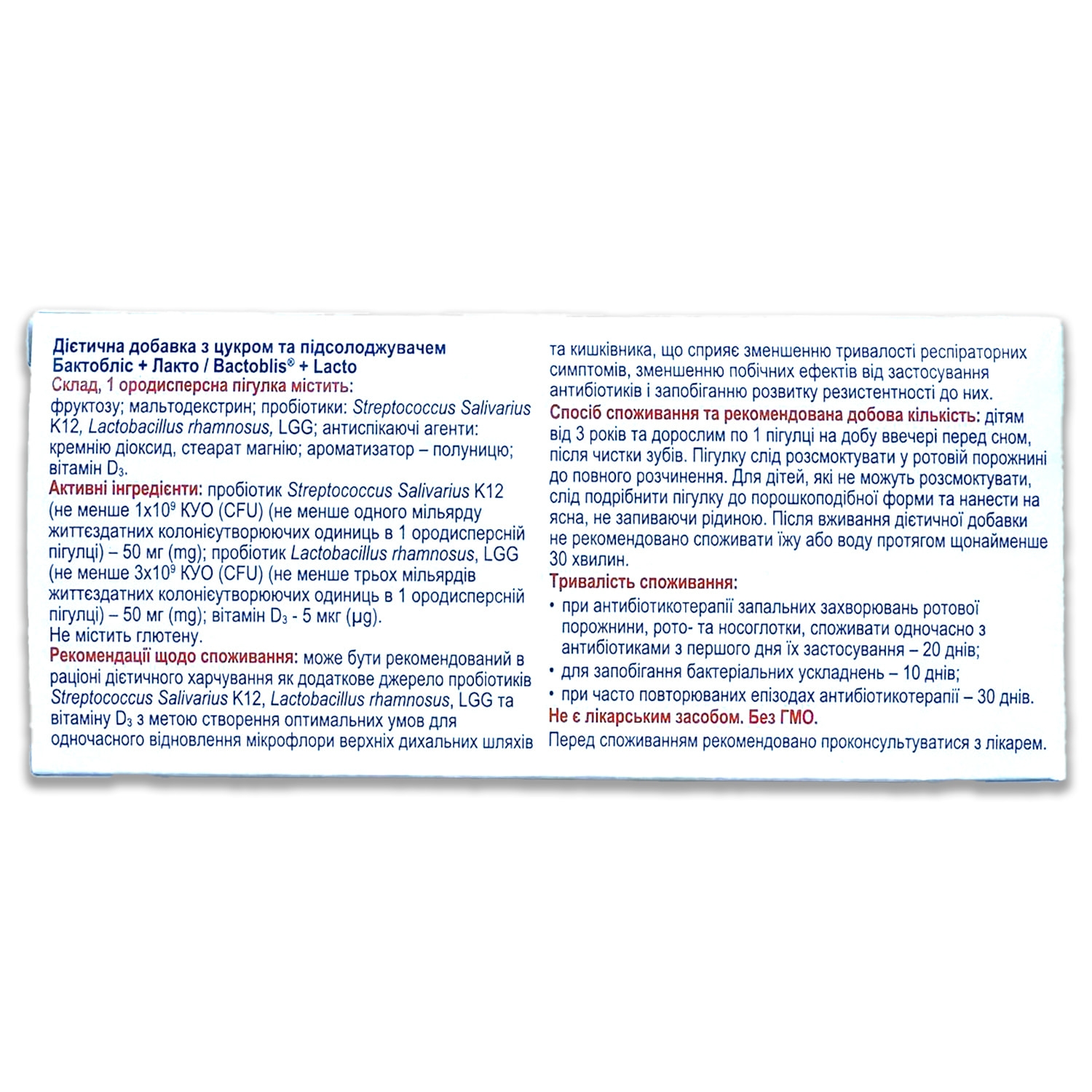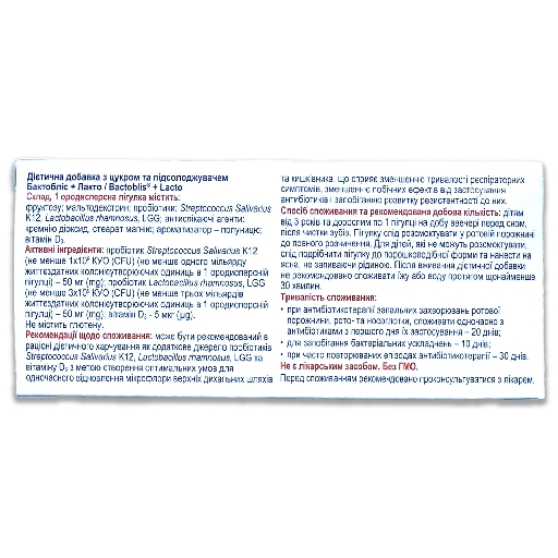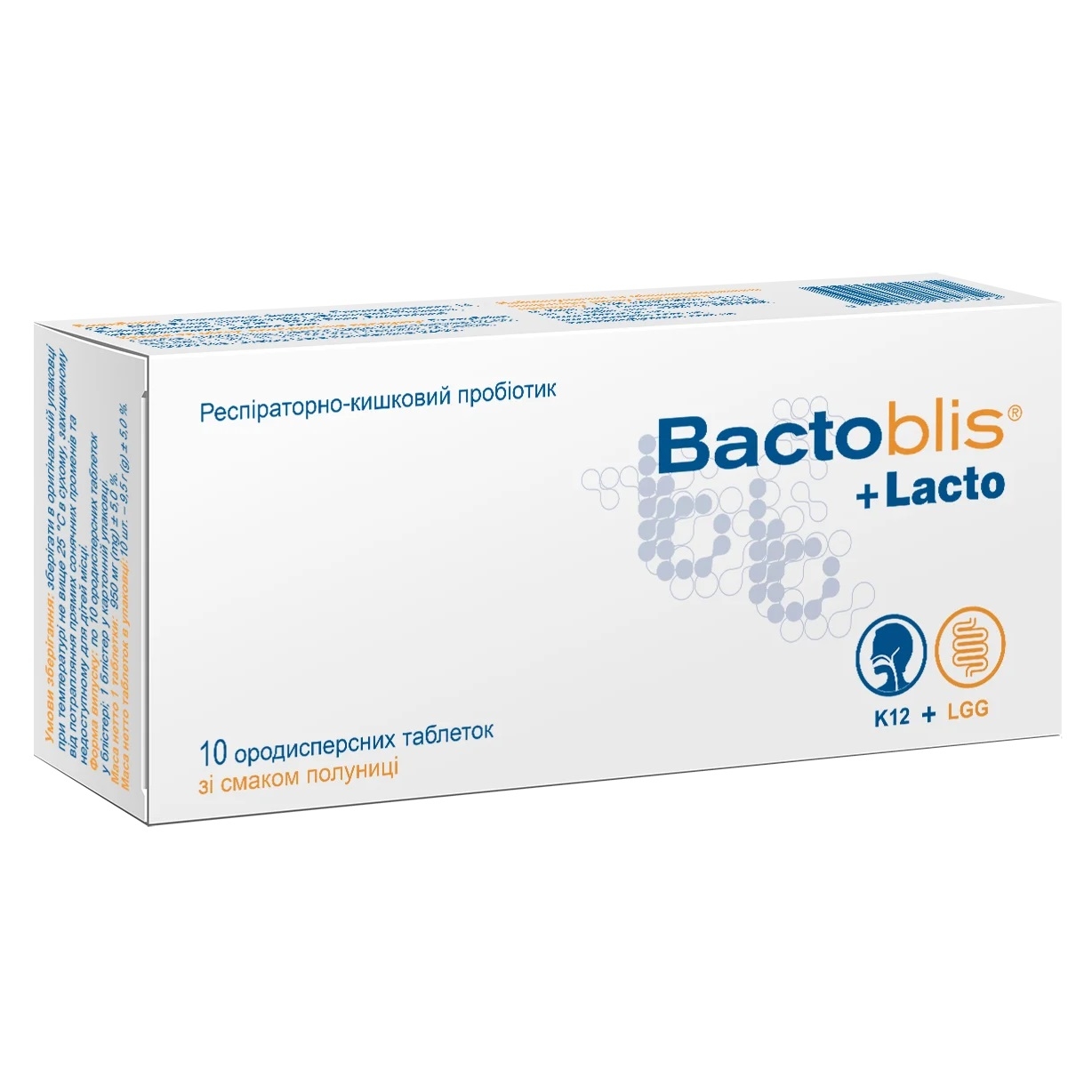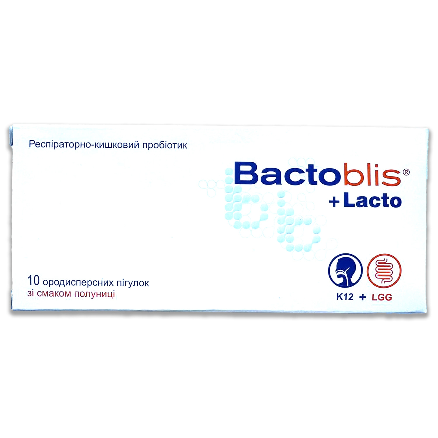 Бактобліс + Лакто (ородисперсні пігулки) – респіраторно-кишковий пробіотик, що сприяє відновленню здорового мікробіому, як у рото- та носоглотці, так і у кишківнику, завдяки поєднанню респіраторного штаму Streptococcus salivarius K12 (для покращення місцевого захисту верхніх дихальних шляхів) з кишковим пробіотичним штамом Lactobacillus rhamnosus, LGG s LGG (для попередження діареї).