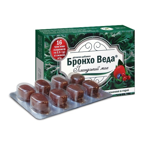 Бронхо Веда Ісландський мох трав’яні льодяники зі смаком ягід рекомендовано вживати дітям від 6-ти років та дорослим для полегшення кашлю, зменшення подразнення в горлі при сезонних застудних захворюваннях. Льодяники сприяють нормальному функціонуванню слизової оболонки горла та гортані, зменшенню першіння та сухості в горлі. Також рекомендовано людям при осиплості голосу, чия професійна діяльність пов’язана з підвищеним навантаженням на голосові зв'язки: вчителям, лекторам тощо.
