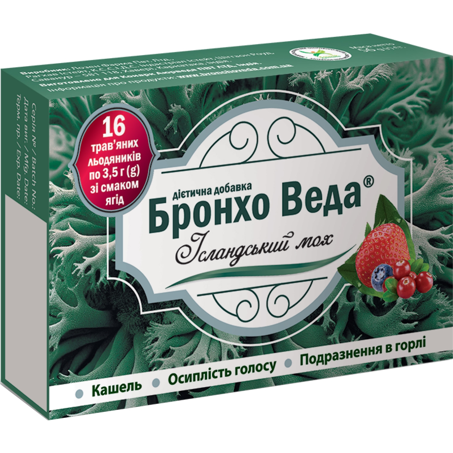 Бронхо Веда Ісландський мох трав’яні льодяники зі смаком ягід дієтична добавка.