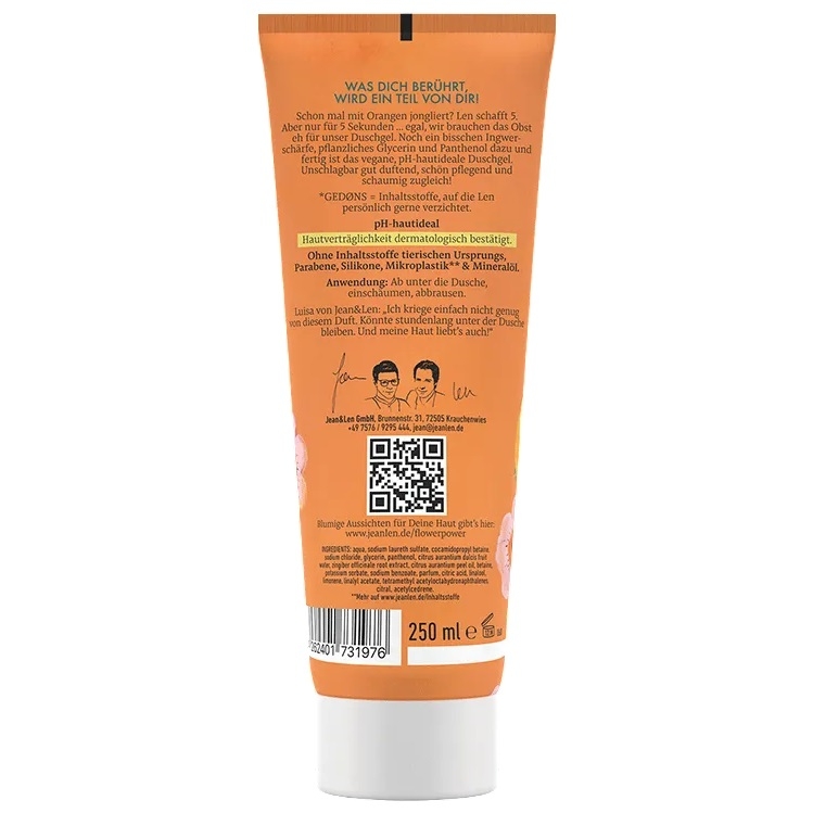 Ви коли-небудь пробували жонглювати апельсинами? Лен може впоратися з 5. Але лише на 5 секунд... нам все одно потрібен був цей фрукт для нашого гелю для душу. Ми додали дрібку імбиру до екстракту апельсина разом із зволожуючим пантенолом та рослинним гліцерином, і так народився веганський гель для душу зі збалансованим pH. Побалуйте себе відновлюючим фруктовим ароматом із поєднанням соковитого апельсина та пряного імбиру. Рослинний гліцерин та пантенол запобігають висиханню шкіри. У поєднанні з цінними екстрактами цей гель для душу ідеально підходить для щоденного очищення шкіри. Побалуйте себе м’якою та гладкою шкірою прямо в душі.