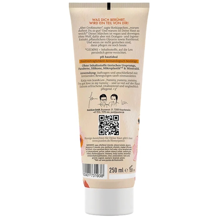 Чи знаєте ви, що Лен дуже любить казки? Ось що він написав про лосьйон для тіла з апельсином/імбиром: «Але бабусю, — сказала Червона Шапочка, — чому ти так добре пахнеш? І чому твоя шкіра така м’яка?» Ця казка веганська, тому вовка немає, але в ній є екстракти апельсина та імбиру, рослинний гліцерин та пантенол. І якщо вони не жили довго та щасливо, то вони все одно зволожують шкіру. Що ж, можливо, Лен черпав натхнення з відомої казки для цієї казки. Ми вважаємо, що це чудово, проте! Ось інформація, яка не потрапила до статті: з лосьйоном для тіла «Апельсин та Імбир», який має надлегку текстуру та швидко поглинається, ви побалуєте себе помітно м’якою шкірою.