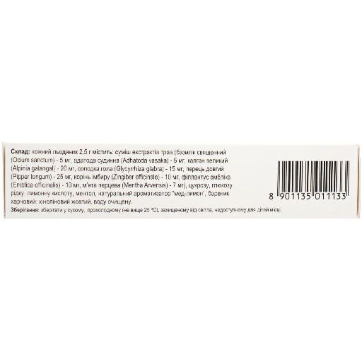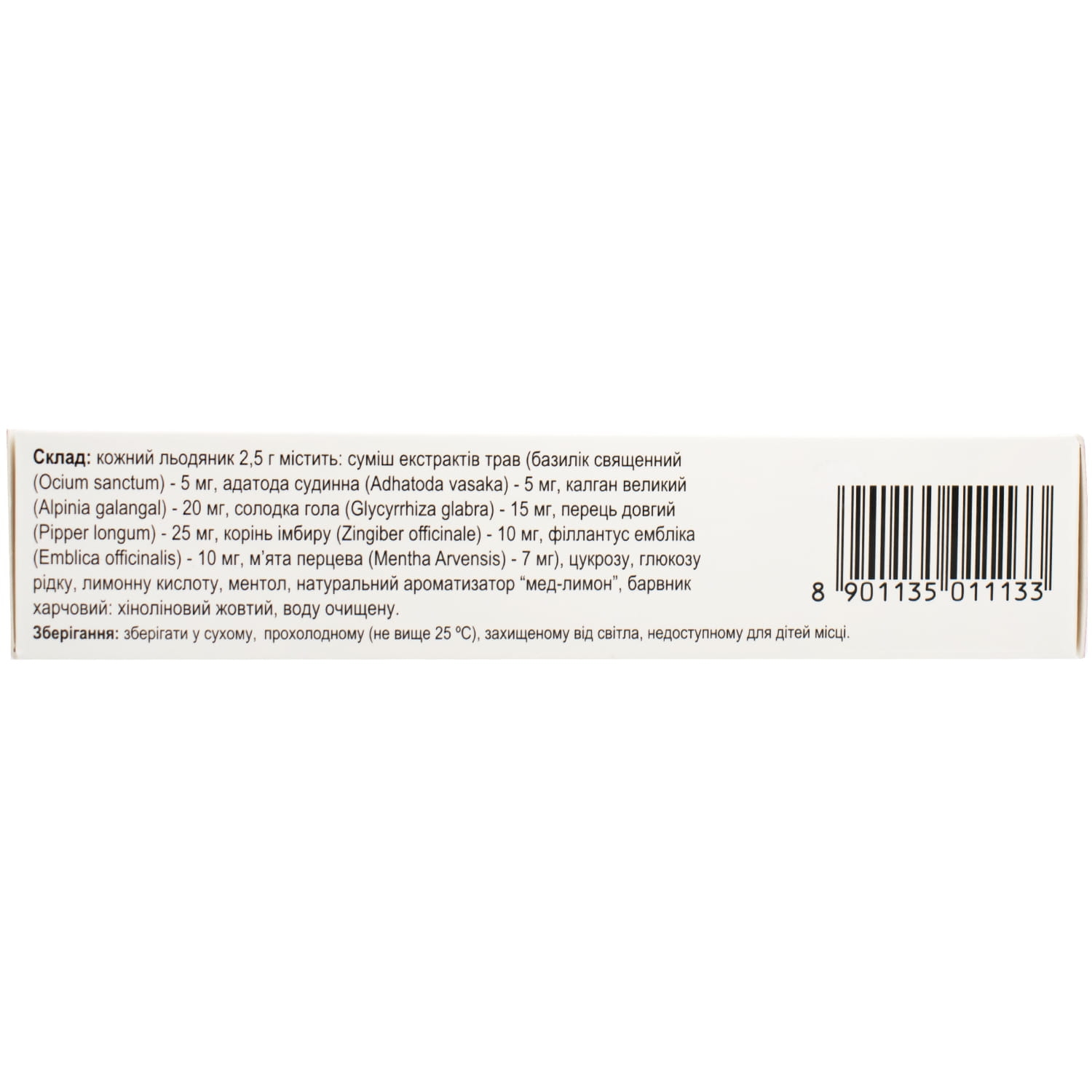 Кожний льодяник 2,5 г містить: суміш екстрактів трав (базилік священний (Ocium sanctum) - 5 мг, адатода судинна (Adhatoda vasaka) — 5 мг, калган великий (Alpinia galangal) — 20 мг, солодка гола (Glycyrrhiza glabra) — 15 мг, перець довгий (Pipper longum) — 25 мг, корінь імбиру (Zingiber officinale) — 10 мг, філлантус ембліка (Emblica officinalis) — 10 мг, м'ята перцева (Mentha Arvensis) - 7 мг), цукрозу, глюкозу рідку, лимонну кислоту, ментол, барвник харчовий: жовтий “сонячний захід”, натуральний ароматизатор “апельсин”, воду очищену.