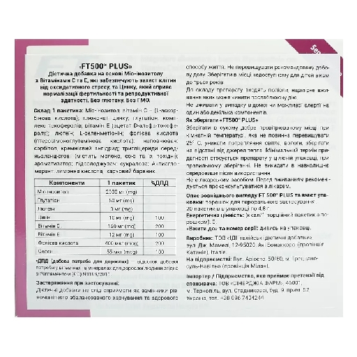 FT500 Плюс – це дієтична добавка на основі інозитолу з вітамінами С і Е, які сприяють захисту клітин від окисного стресу, і цинку, який сприяє нормальній фертильності і нормальній репродуктивності.