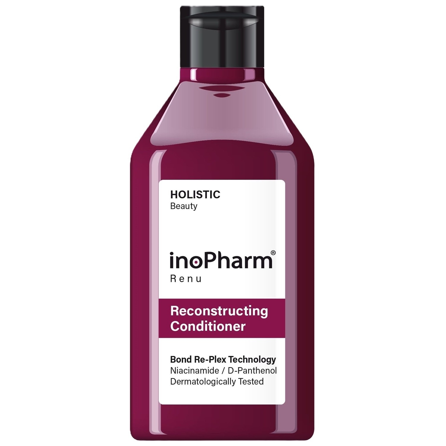 Відновлювальний кондиціонер Renu від inoPharm підходить для пошкодженого волосся. Формула, збагачена ніацинамідом та D-пантенолом, зменшує ламкість волосся та ефективно покращує його міцність. Завдяки технології Bond Re-Plex, яка безпосередньо впливає на кератинові ланцюги та мікрозв'язки у волосяних волокнах, – для здорового та яскравого волосся з inoPharm.