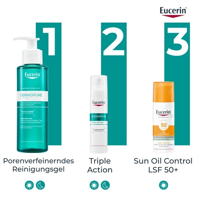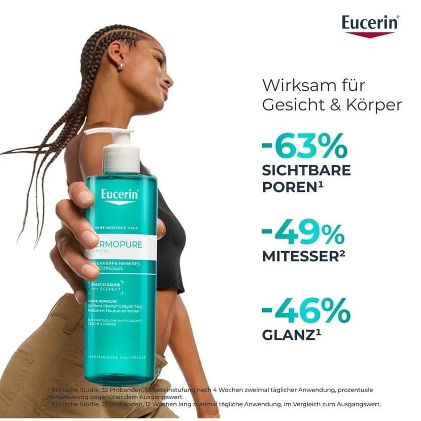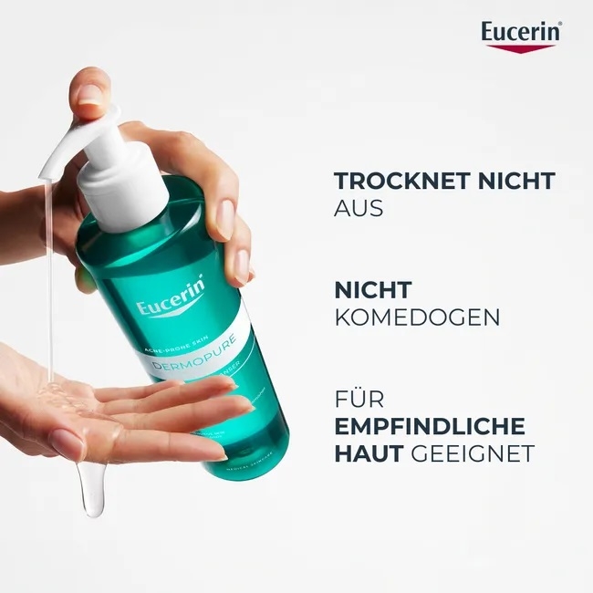 Нанесіть гель на вологу шкіру обличчя або тіла. Легко помасажуйте до утворення піни, після чого ретельно змийте водою. Уникайте потрапляння в очі. Використовуйте вранці та ввечері перед нанесенням засобів догляду Eucerin DermoPure. Може використовуватися як доповнення до медикаментозної терапії акне.