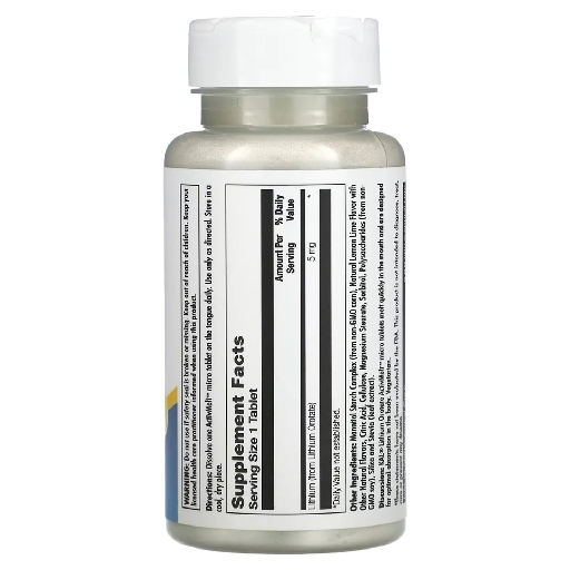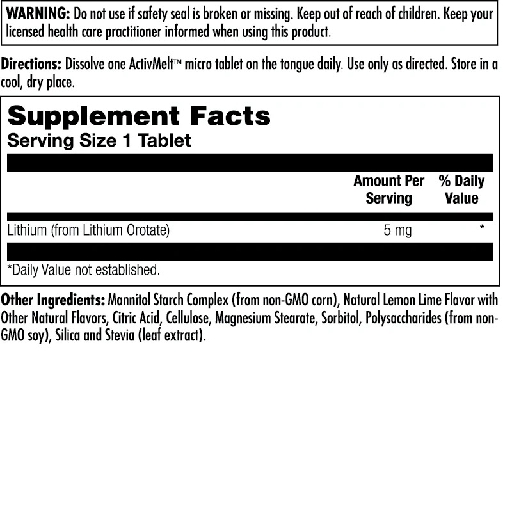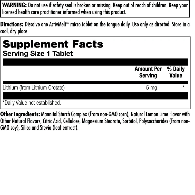 Літій Оротат 5 мг поєднує літій з оротовою кислотою в хелатній формі, розробленій для покращеного засвоєння та використання. Наші мікротаблетки ActivMelt швидко розчиняються в роті та також розроблені для оптимального засвоєння. Крім того, вам сподобається натуральний лимонно-лаймовий смак.