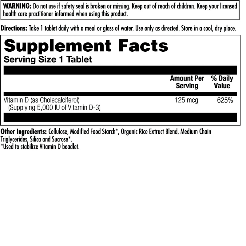 | Вітамін D (у вигляді холекальциферолу) (містить 5000 МО вітаміну D3) | 125 мкг | 625 % |