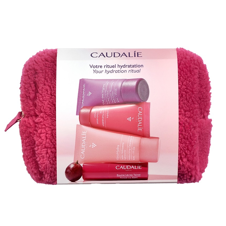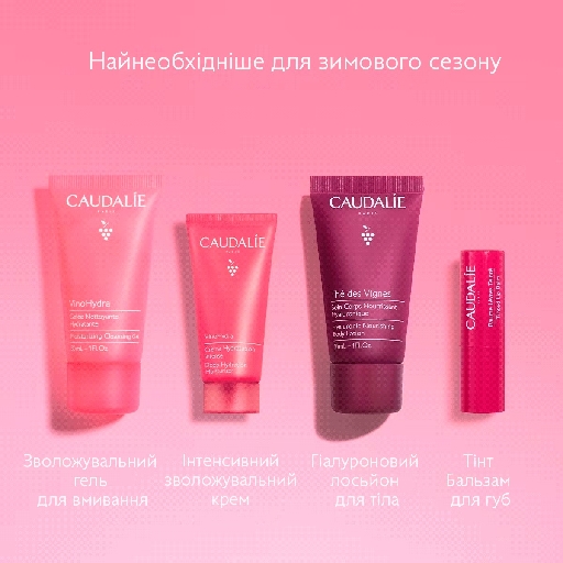 Набір Caudalie (Кодалі) Дорожній 2025 Гіалуроновий лосьйон The des Vignes 30 мл, Vinohydra інтенсивний зволожувальний крем 15 мл, Гель для вмивання VinoHydra 30 мл, Тінт Бальзам для губ 4,5 г