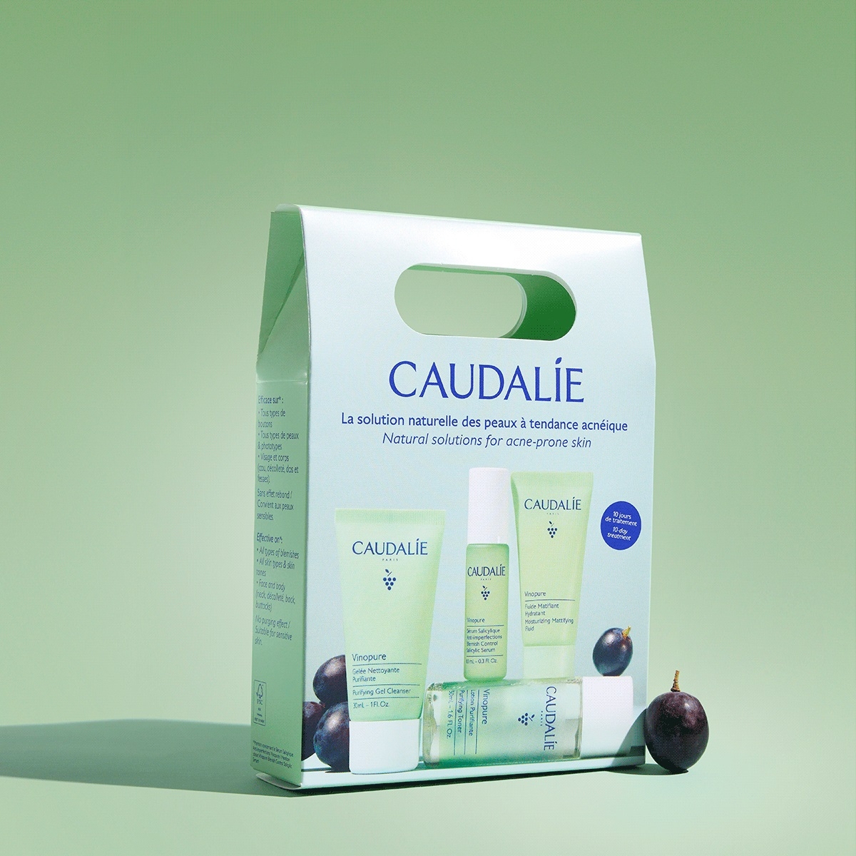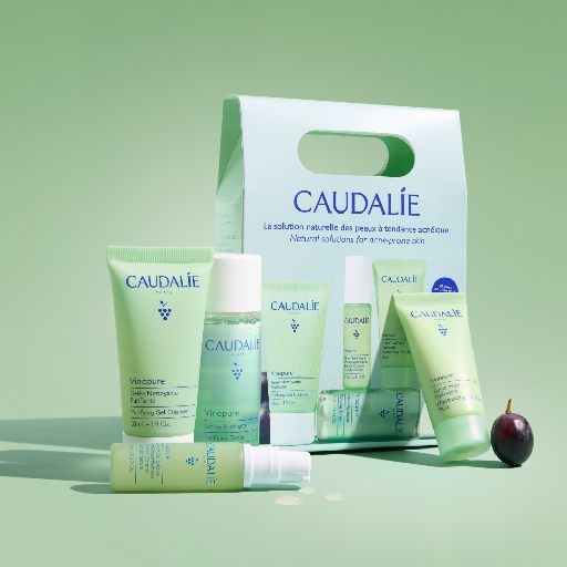 Набір Caudalie (Кодалі) Vinopure (Вінопюр) Стартовий 2025 Желе для очищення Чиста шкіра 30 мл, Сироватка Контроль недосконалості 10 мл, Матуючий флюїд 15 мл, Очищуючий тонік 30 мл