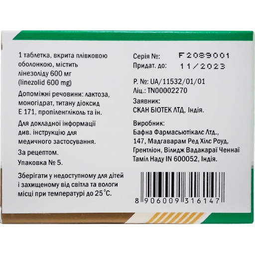 1 таблетка, вкрита плівковою оболонкою, містить лінезоліду 600 мг;