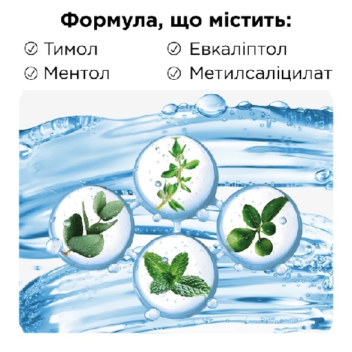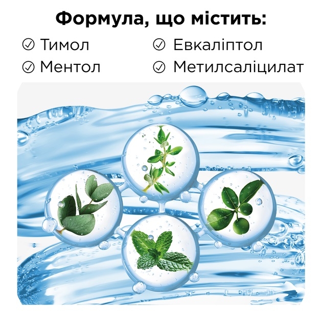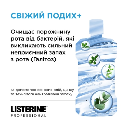 При використанні двічі на день після чищення зубів, очищає порожнину рота від бактерій, які викликають сильний неприємний запах з рота (Галітоз) за допомогою ефірних олій, цинку та технології нейтралізації запаху.