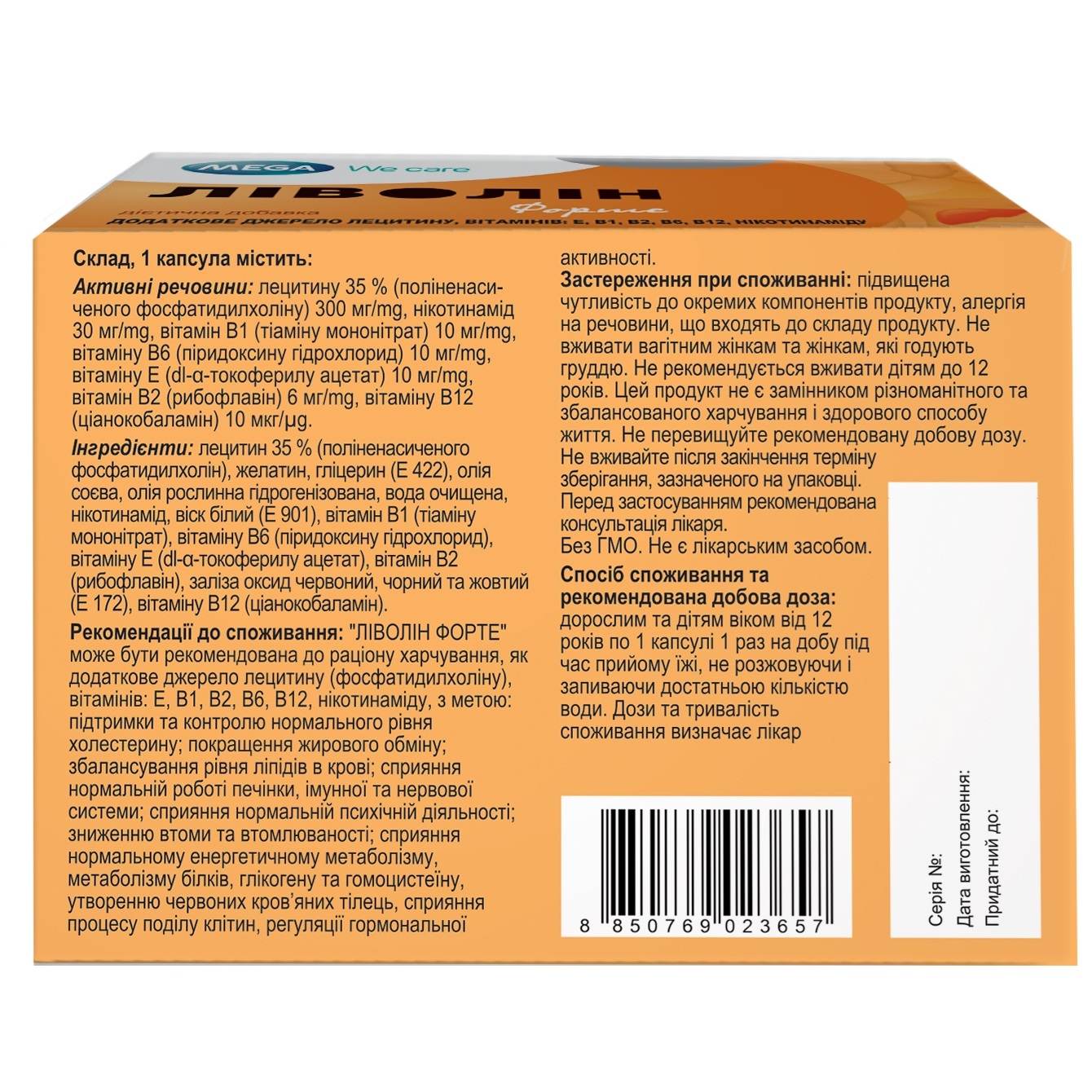 1 капсула містить лецитину 35% (поліненасиченого фосфатидилхоліну) 300 мг, dl-α-токоферилу ацетату (вітаміну Е) 10 мг, тіаміну мононітрату (вітаміну В1) 10 мг, рибофлавіну (вітаміну В2 ) 6 мг, піридоксину гідрохлориду (вітаміну В6) 10 мг, ціанокобаламіну (вітаміну В12 ) 10 мкг, нікотинаміду 30 мг;