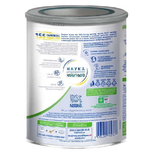 ЛАКТОЗА, рослинні олії (соняшникова з високим вмістом олеїнової кислоти, рапсова з низьким вмістом ерукової кислоти, соняшникова), крохмаль картопляний, галактоолігосахариди (ГОС) (з МОЛОКА) 6,2%, частково гідролізований ізолят білка МОЛОЧНОЇ сироватки, калію фосфат, кальцію цитрат, магнію хлорид, холіну бітартрат, фруктоолігосахариди (ФОС) 0,3%, олія з Мортієрелли альпіні, олія з Шизохітріум, L-аргінін, хлорид калію, натрію хлорид, вітаміни (С, E, ні, (В1), рибофлавін (В2), В6, фолієва кислота, K, D, біотин, В12), L-гістидин, L-фенілаланін, таурин, культура L. Reuteri (не менше 3,7х105 КУО/г (CFU/g)), інозитол, заліза сульфат, кальцій 5'-монофосфат, уридін 5'-монофосфат, аденозин 5'-монофосфат, гуанозин 5'-монофосфат), L-карнітин, цинку сульфат, міді сульфат, марганцю сульфат, калію йодид, натрію селенат. Запаковано у захисному середовищі.