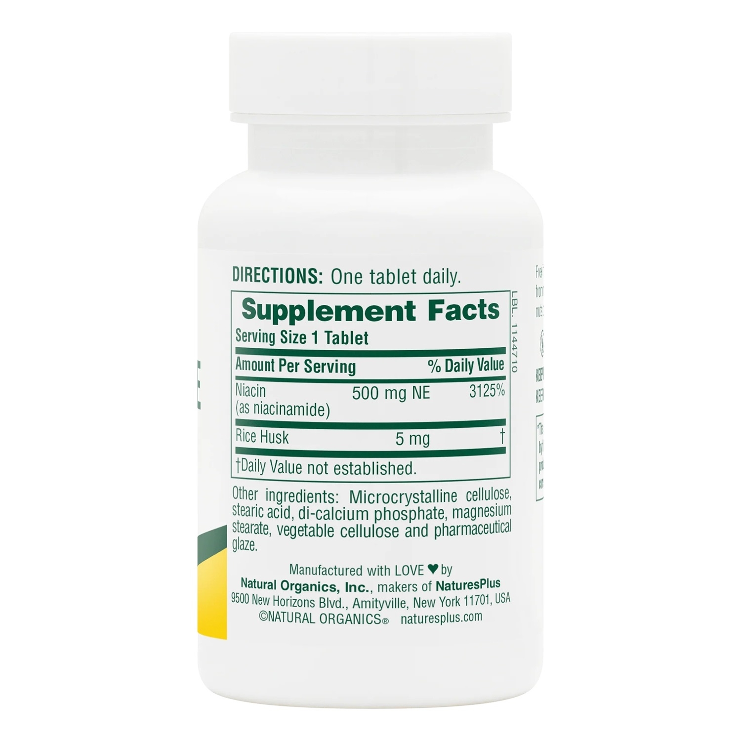 NaturesPlus Niacinamide 500 містить 500 мг вітаміну B3 без промивання у формулі з пролонгованою дією для підтримки енергії, мозку та імунітету.*