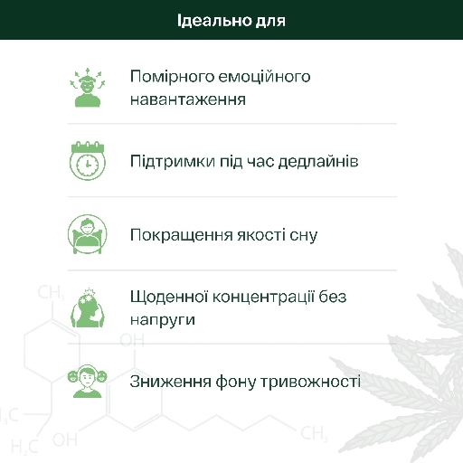 Підійде тим, хто страждає від тривожності, стресу, періодичного болю, спричиненого хронічними захворюваннями або перенапруженням унаслідок фізичного навантаження. Допоможе розслабитися і заснути. Покращує концентрацію та увагу протягом дня.