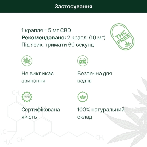 - Не містить ТГК тому відсутній психоактивний ефект. Допускається до застосування водіями.