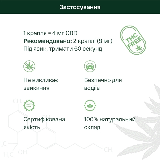 - Не містить ТГК тому відсутній психоактивний ефект. Допускається до застосування водіями.