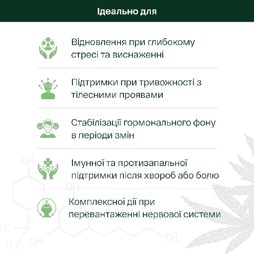 Підійде тим, хто страждає від тривожності, стресу, періодичного болю, спричиненого хронічними захворюваннями або перенапруженням унаслідок фізичного навантаження. Допоможе розслабитися і заснути. Покращує концентрацію та увагу протягом дня.