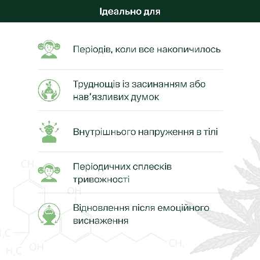 Підійде тим, хто страждає від тривожності, стресу, періодичного болю, спричиненого хронічними захворюваннями або перенапруженням унаслідок фізичного навантаження. Допоможе розслабитися і заснути. Покращує концентрацію та увагу протягом дня.