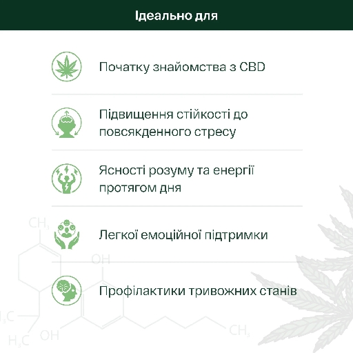 Підійде тим, хто страждає від тривожності, стресу, періодичного болю, спричиненого хронічними захворюваннями або перенапруженням унаслідок фізичного навантаження. Допоможе розслабитися і заснути. Покращує концентрацію та увагу протягом дня.