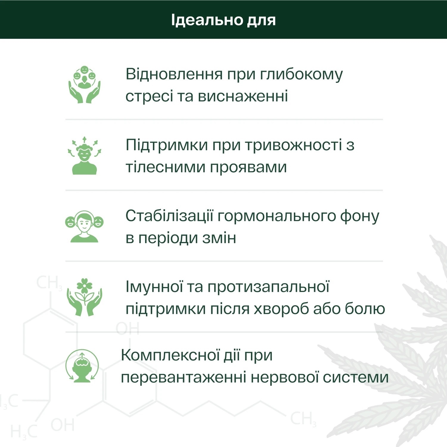 Підійде тим, хто страждає від тривожності, стресу, періодичного болю, спричиненого хронічними захворюваннями або перенапруженням унаслідок фізичного навантаження. Допоможе розслабитися і заснути. Покращує концентрацію та увагу протягом дня.