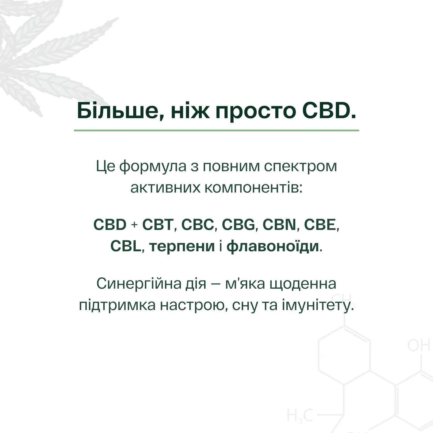 - Кокосова олія МСТ 10 мл, дистилят канабідіолу широкого спектра 1 мл (КБД - 6%, CBG - 0.2%, CBC - 0.5%, CBN - 0.3%, CBL - 0.05%, CBT - 0.6%, CBE - 0.3%),