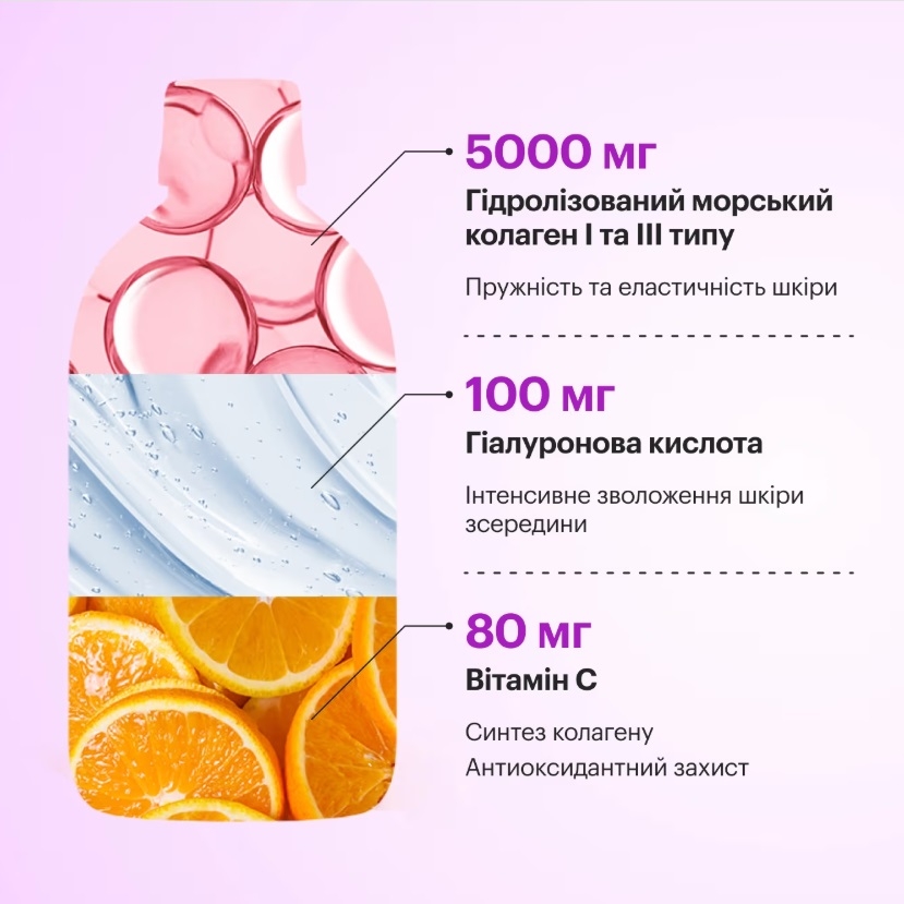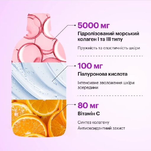Питний колаген для підтримки краси та молодості. У складі — морський колаген, гіалуронова кислота та вітамін С для максимальної ефективності.