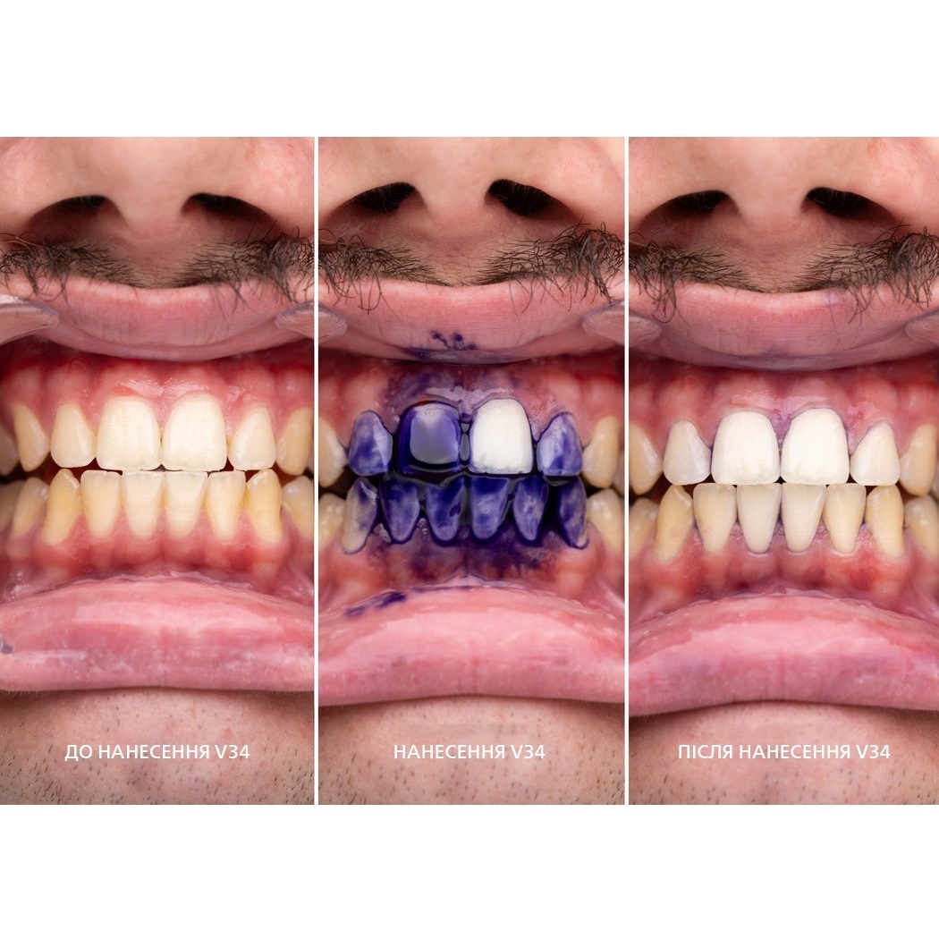 V34— це засіб для відбілювання, який тимчасово маскує забарвлення, особливо жовті відтінки зубів.