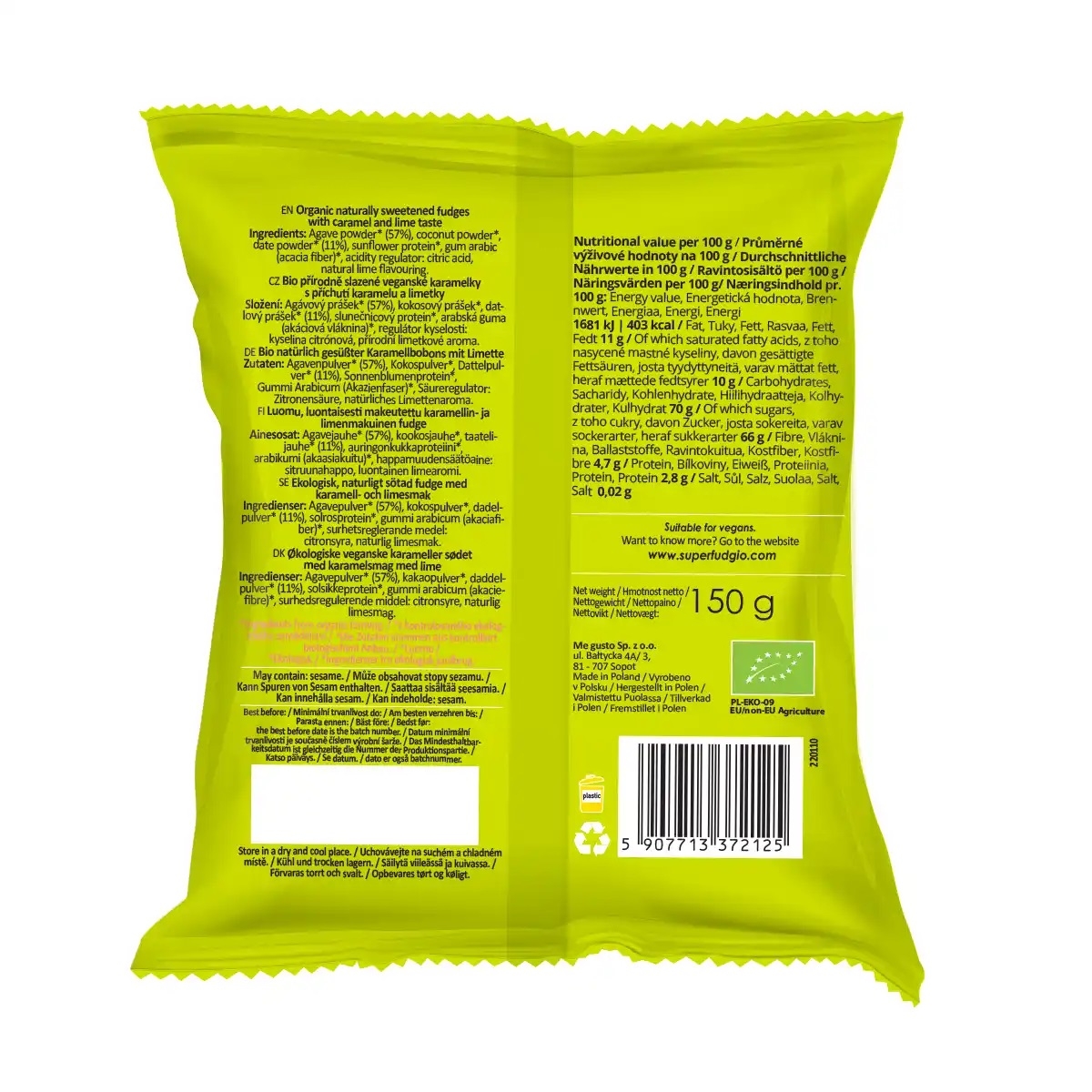Цукерки Super Fudgio Карамель і лайм 150 г — м'які органічні цукерки-помадки з яскравим, освіжаючим смаком карамелі та лайма. Ці веганські цукерки — чудовий вибір для всієї родини, особливо для дітей та людей з харчовими обмеженнями. Ніжна текстура, що тане в роті, та оригінальне поєднання смаків роблять їх справжніми корисними ласощами.