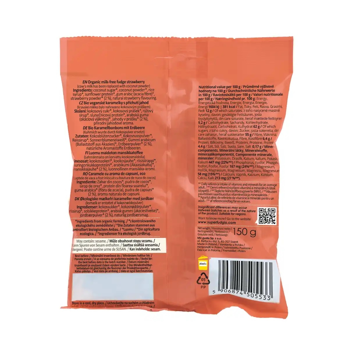 Органічні цукерки Super Fudgio Полуничні 150 г створені як альтернатива цукеркам, які містять звичайний цукор. Ідеальний солодкий та корисний перекус.