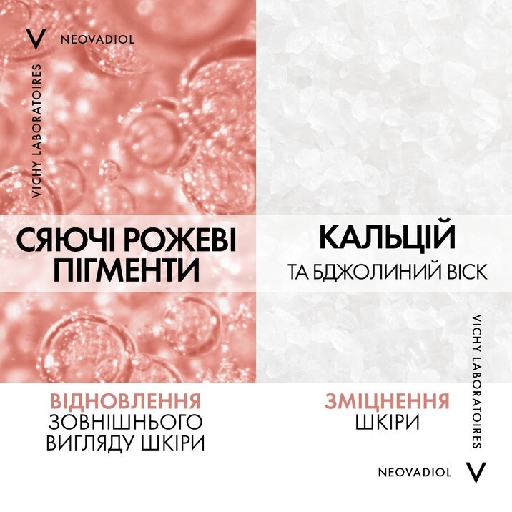 Кальцій, бджолиний віск та сяючі рожеві пігменти в денному кремі Неовадіол Роуз Платиніум сприяють зміцненню шкіри та відновленню її зовнішнього вигляду. Відновлює еластичність і природне сяйво після першого використання.