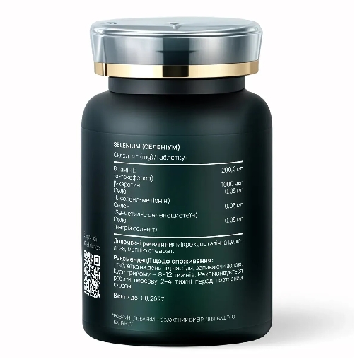 Selenium 150 mcg — комплекс із трьох форм селену (селеніт, селенометіонін, селеноцистеїн), підсилений вітаміном Е та β-каротином.